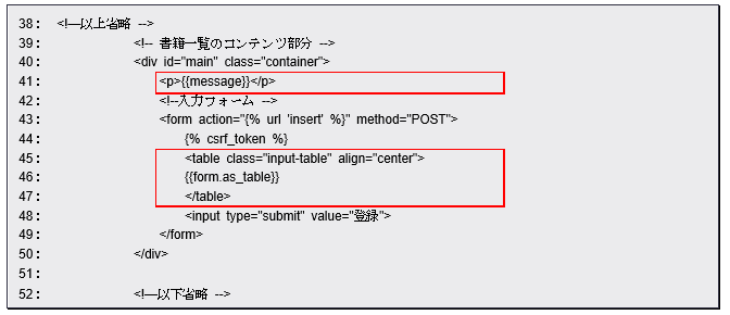 登録画面(Template)には入力フォームを表示させるためのform(formBookクラスのインスタンス)、エラーがある場合にはエラー内容を表示させるための変数errorを引き渡す必要があります。