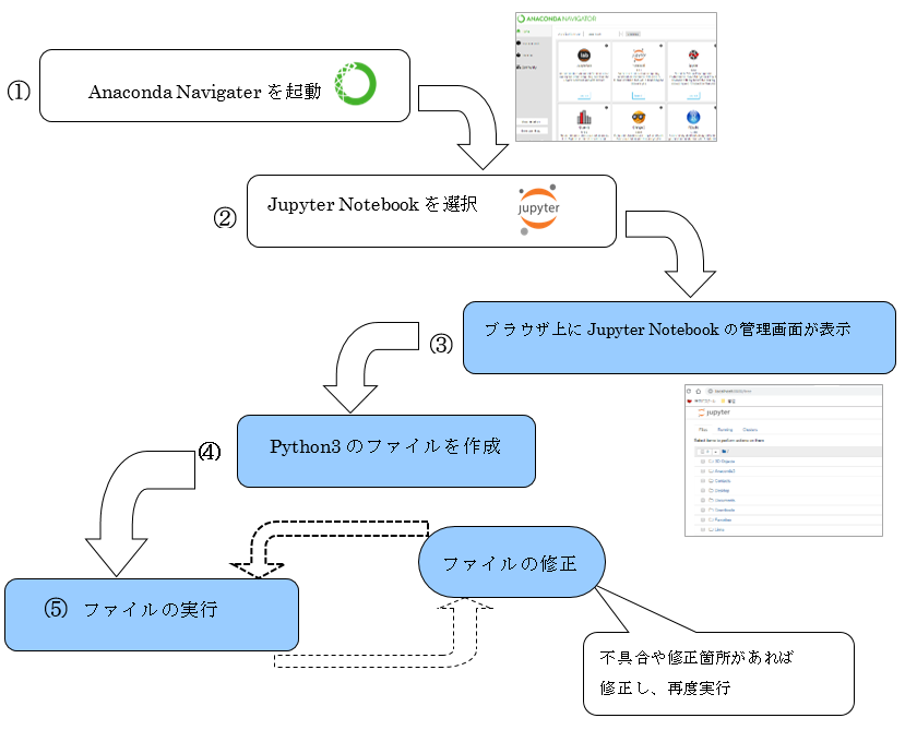 Pythonでプログラミングを行う基本的な流れは以下の図のようなります。