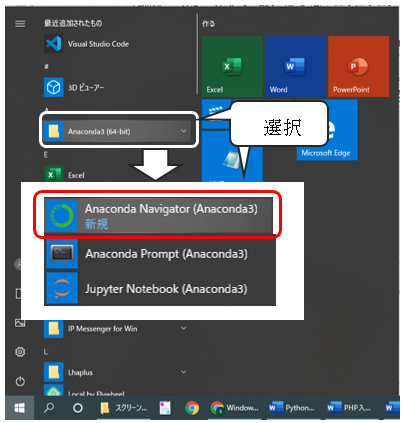 JupyterNotebookを起動させるために、AnacondaNavigatorを実行します。スタートメニューから、「Anaconda3(64-bit)」を選択すると、Anaconda Nabigatorのメニューが表示されるのでクリックしてください。