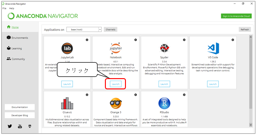 Anaconda Navigatorが表示されるので、Jupyter Notebookを選択してください。