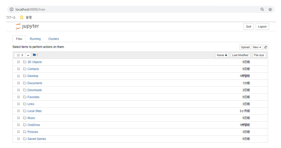ブラウザ上に以下のような画面が表示されたら、無事にJupyter Notebookが起動できました。