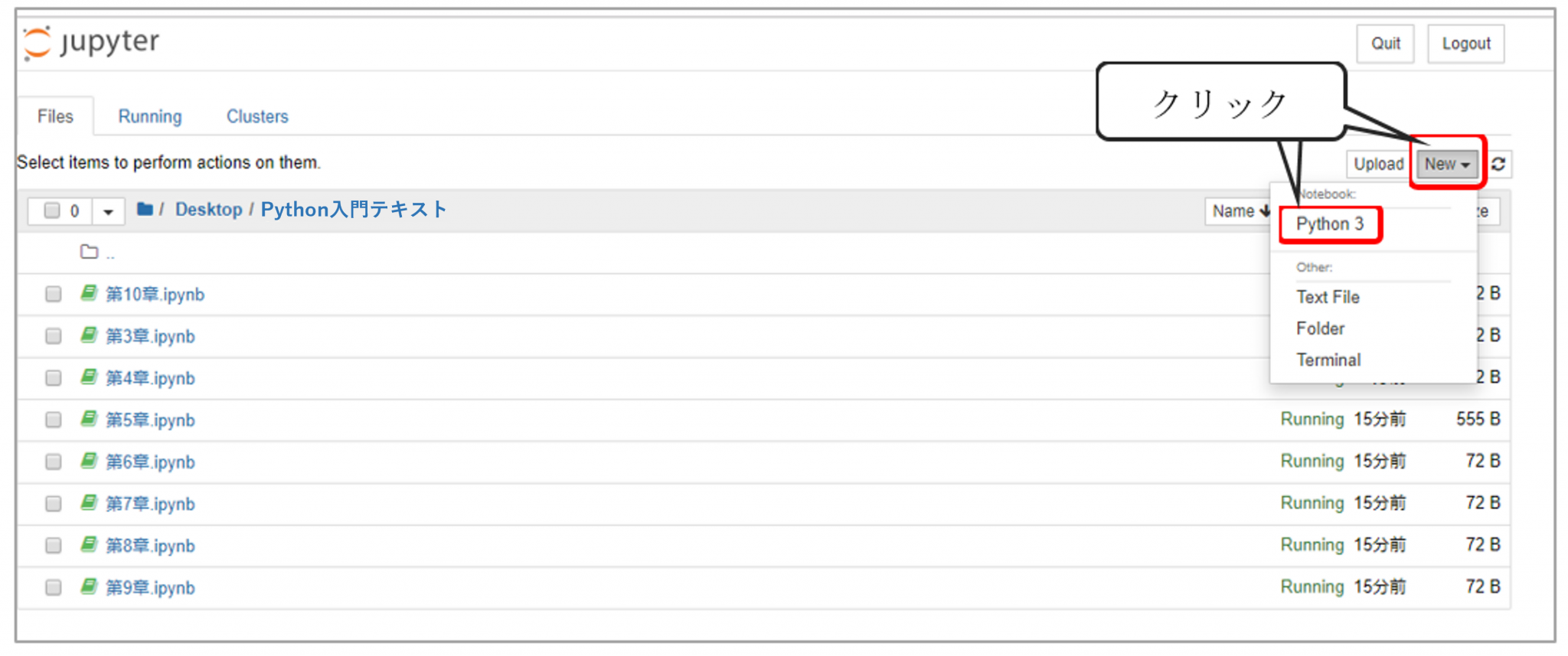 デスクトップの階層に「Python入門テキスト」というフォルダを作成した後、Jupyter Notebookの画面から「Desktop」のフォルダを選択し、先程作成した「Python入門テキスト」というフォルダを選択してください。