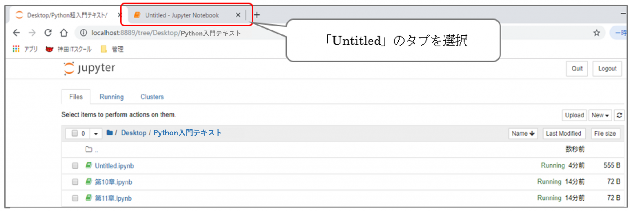 「Python入門テキスト」のフォルダを確認(「Desktop/Python入門テキスト」というタブを選択)すると、フォルダ内に「Untitled.ipynb」という名前のファイルが作成されていることが確認できます。