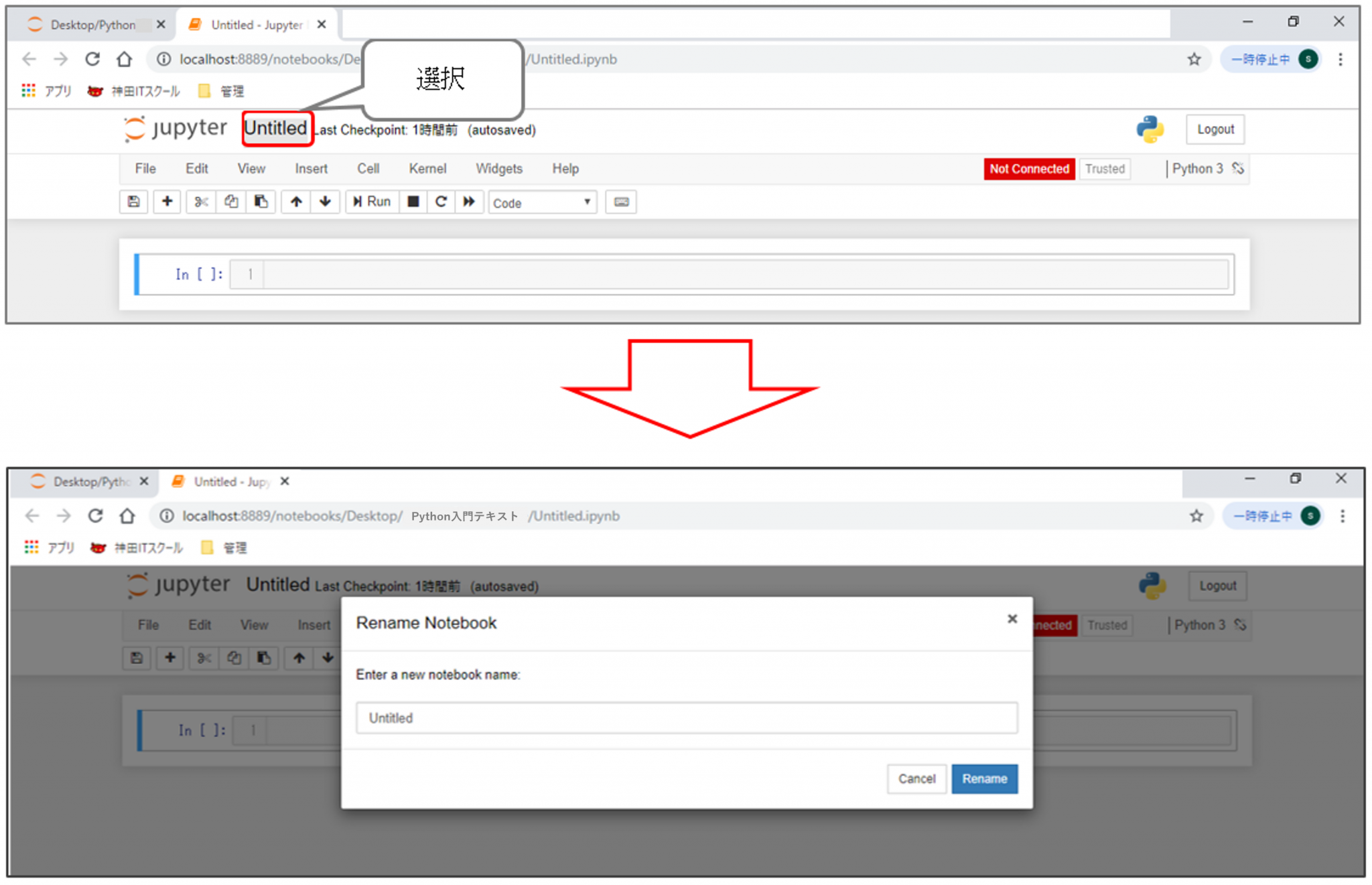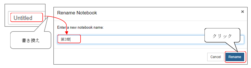 「Rename Notebook」上で「Untitled」を「第3章」に書き換え、Renameをクリックします。