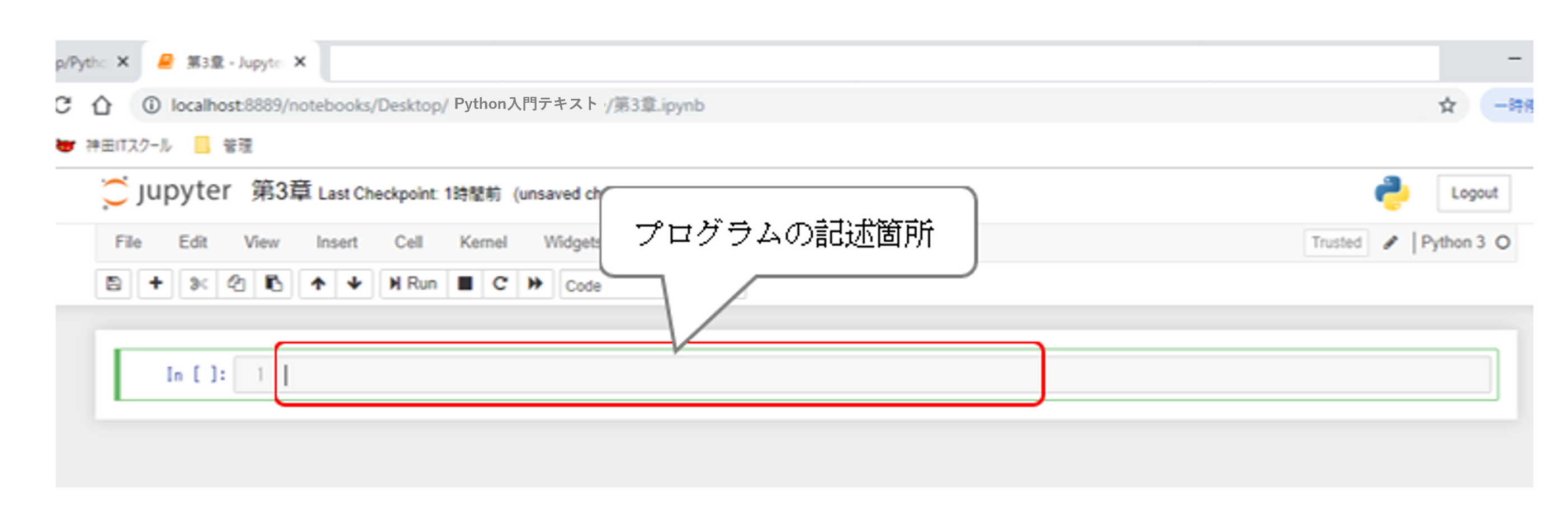 JupyterNotebookでは「In[●●]:」と記載された緑の枠で囲まれた箱(セル)にプログラムを作成し、下の図における赤い枠線の中にソースコードを作成します。