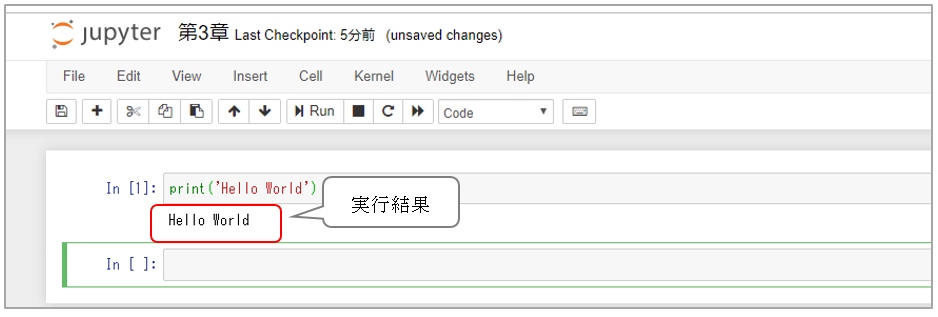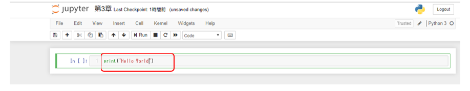 前項で作成したPythonファイルである「第3章. ipynb」のソースコードを編集し、HelloWorldと出力するプログラムを作成します。