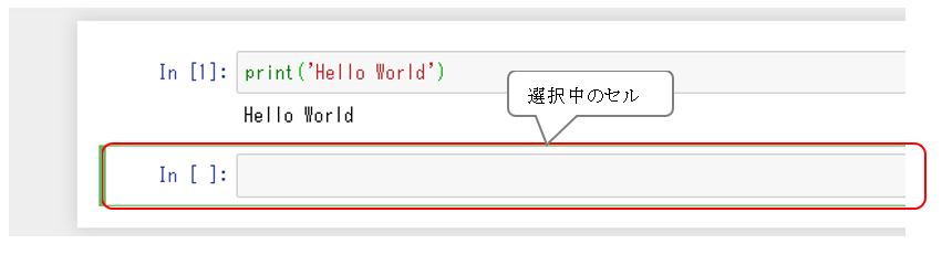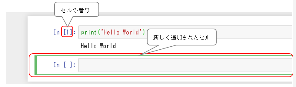 この括弧内の数字はセルの番号であり、実行後に追加された緑の枠線で囲まれた箱は、新しいセルになります。