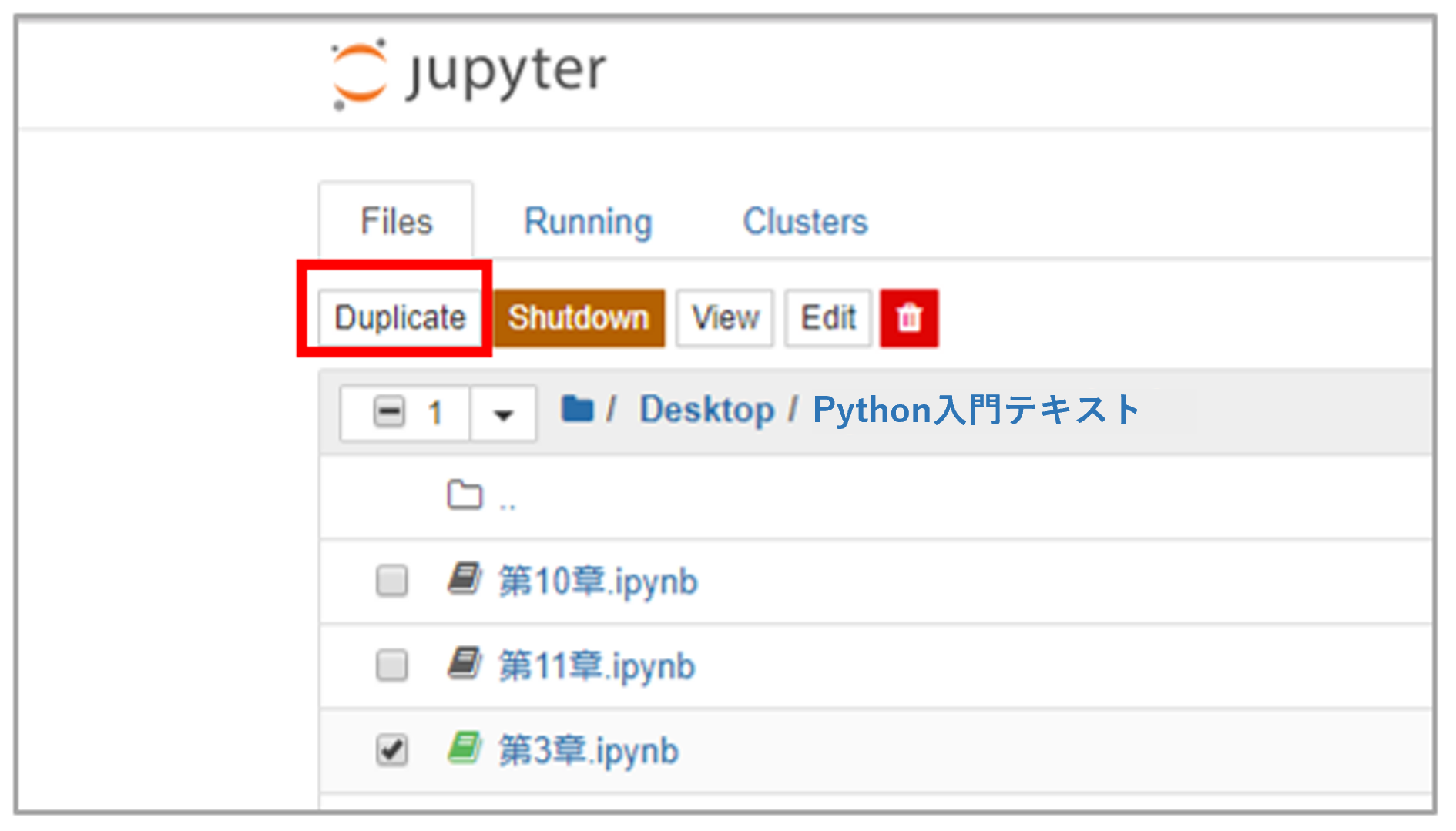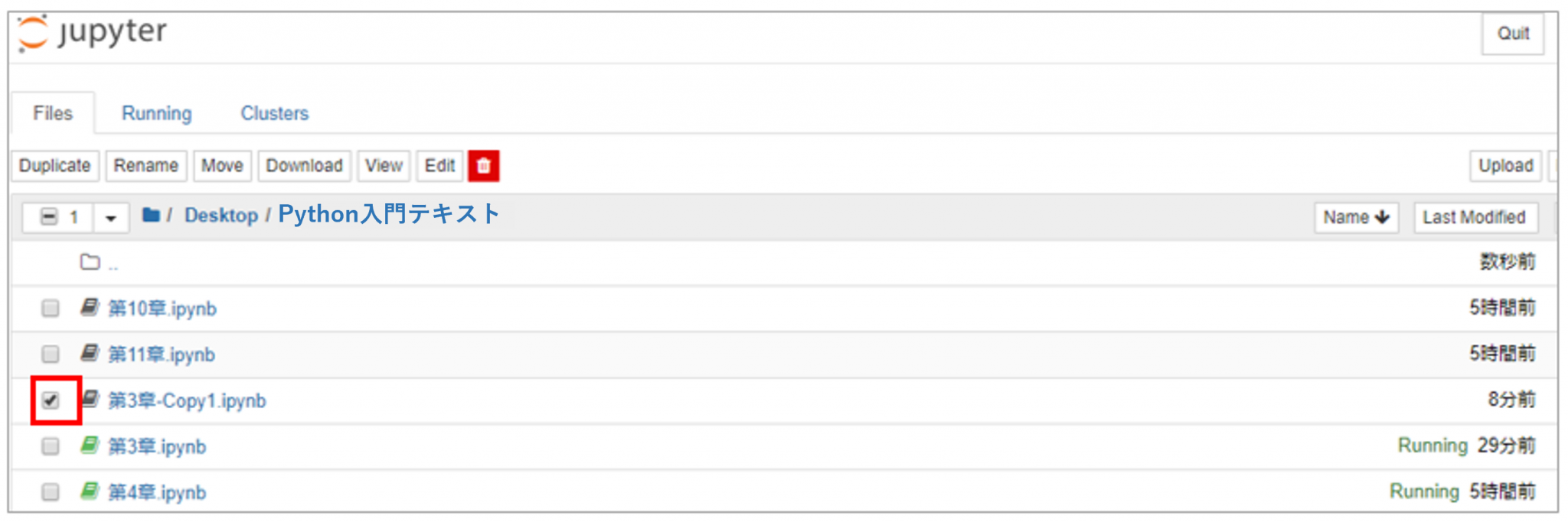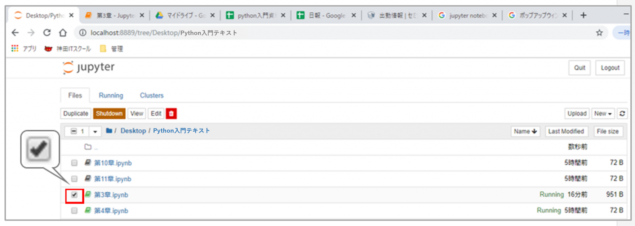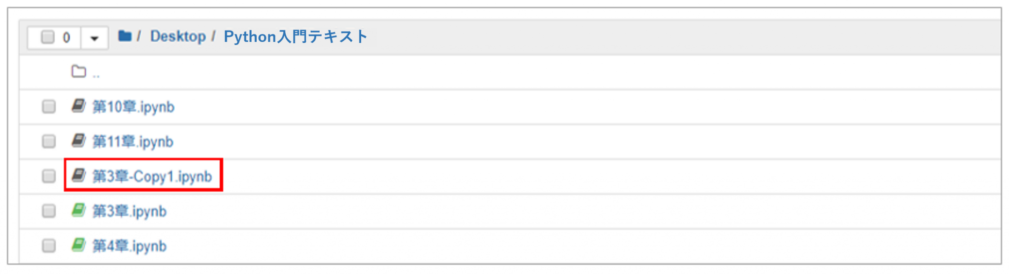 フォルダの画面が表示されたら、対象のファイル「第3章.ipynb」を選択(左クリック)します。すると「第3章.ipynb」の行頭の「☐」が「☑」に変わっているのが確認できます。