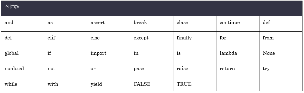 • Pythonで意味を持つ予約語(ifやforなど)ではないこと