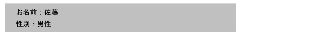 [html] name = ‘佐藤’ gender = ‘男性’   print(‘お名前:’ + name) print(‘性別:’ + gender)   [/html]