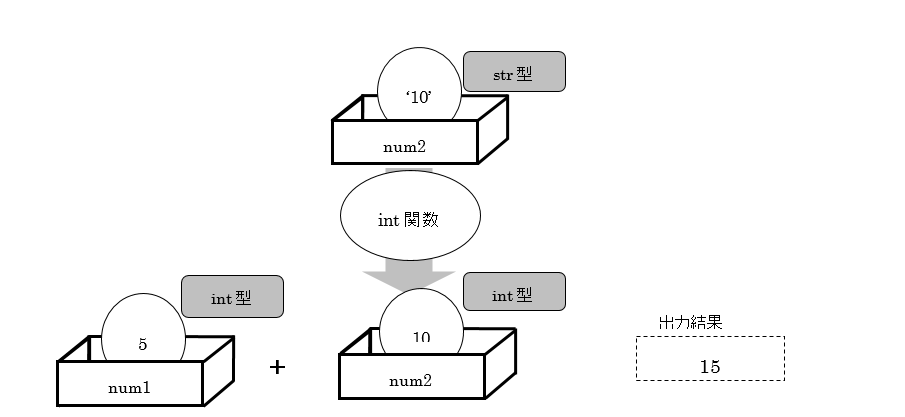 データ型の変更は、整数(int型)から文字列(str型)に変換するときstr関数、文字列から整数に変換するとき、int関数が用いられます。