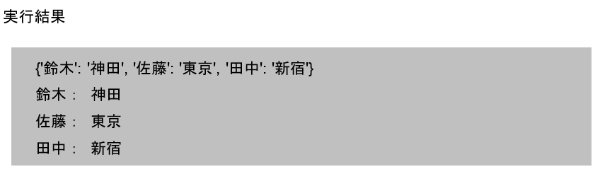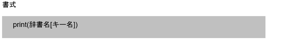 またリスト型変数と同様、「辞書名[キー名]」で各要素の値が取得できます。