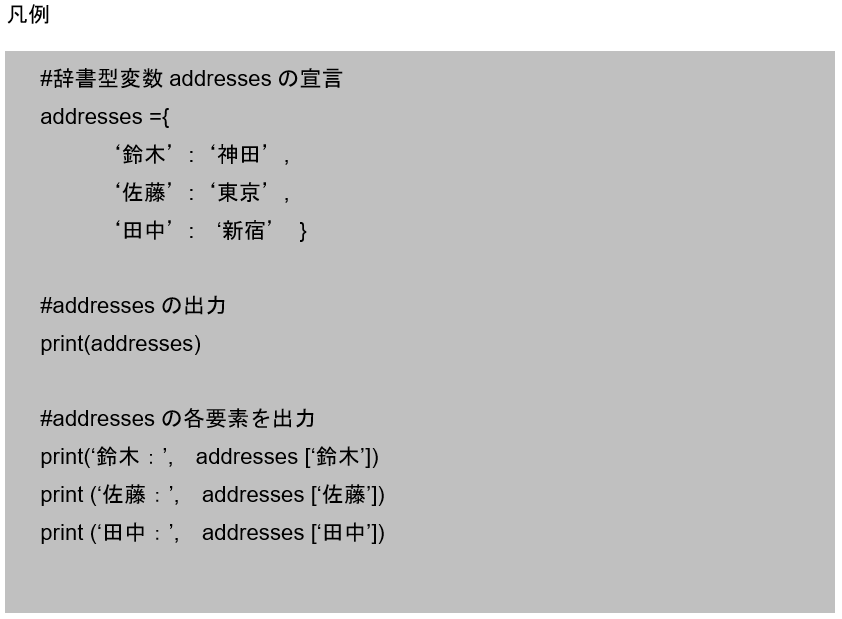 辞書型変数を宣言する際には、キー名、コロン:、データの中身で各要素を表し、要素間はカンマ, で区切り、全体をなみ括弧{ }で囲います。