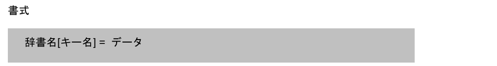 辞書に新しく値を追加する場合は、キー名を用いて以下のような書式で行います。