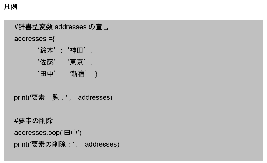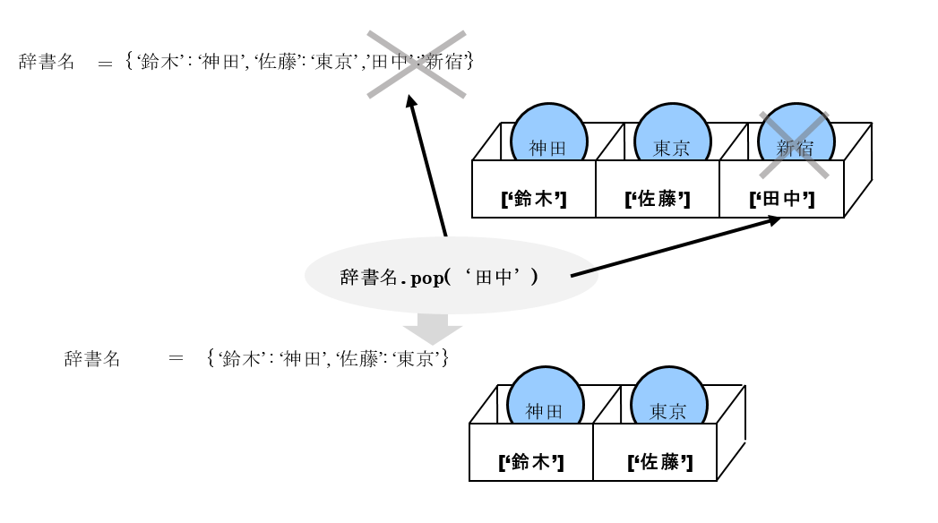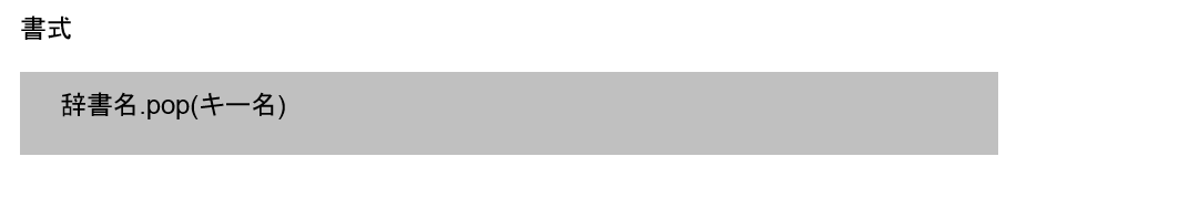 辞書型変数では、要素削除するためのメソッドとして用意されたpopメソッドを使用して、要素の削除を行います。