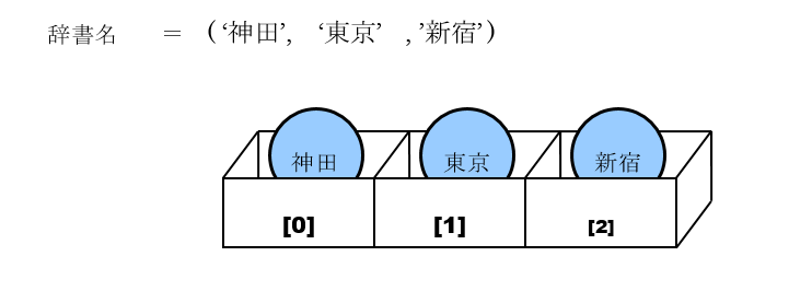 一方、辞書型変数では、インデックス番号の代わりに独自の文字列のキーを変数の宣言時に指定し、各要素の値を取得する際には、各要素に指定したキーを使って、辞書名[キー]と表記します。