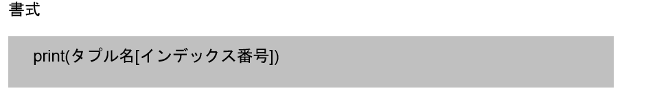 ポイント・ リスト同様、タプルには各要素にインデックス番号があり、「配列名[インデックス番号]」で各要素の値にアクセスできる。