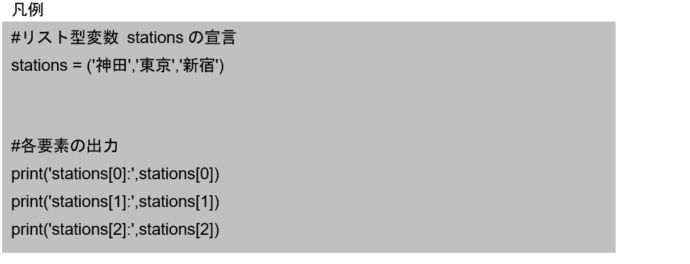 リスト型変数では各要素の値を取得する際、各要素に自動で割り振られたインデックス番号を使って、リスト名[インデックス番号]と表記しました。