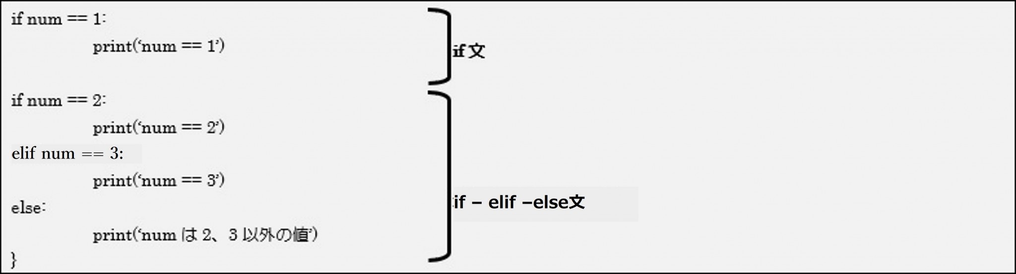 パターン例 : if文と複数条件式(if – elif – else)を使った記述