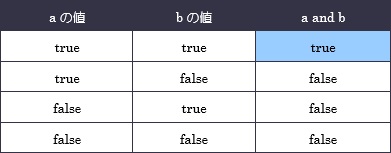 「and」は論理積とも呼ばれ、演算子の左辺と右辺の値がともに「true」の場合だけ、全体がtrueになります。