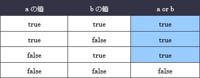 「or」は論理和とも呼ばれ、演算子の左辺または右辺の値が少なくとも1つがtrueの場合に、全体がtrueになります。つまり、条件のうち1つ以上満たせば全体の式がtrueになります。