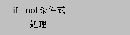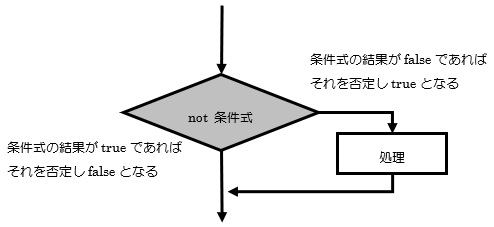 論理演算子「not」は条件の否定を表すものですので、この場合は、もし条件式の結果がtrueならそれを否定されるので処理は行われない、もし条件式の結果がfalseならそれを否定されるので処理が行われるということになります。