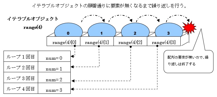 このfor文におけるイテラブルオブジェクト(凡例ではrange(4))には、「0, 1, 2, 3,」の各要素が含まれています。