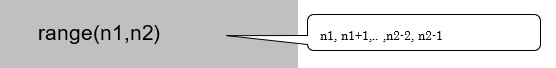 範囲を指定する場合は、上記のようにrange内に引数となる数字を二つ指定し、range(n1,n2)には、n1からn2−1までの要素が含まれます。