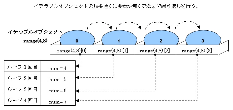 このfor文におけるイテラブルオブジェクト(凡例ではrange(4,8))には、「4, 5, 6, 7,」の各要素が含まれています。