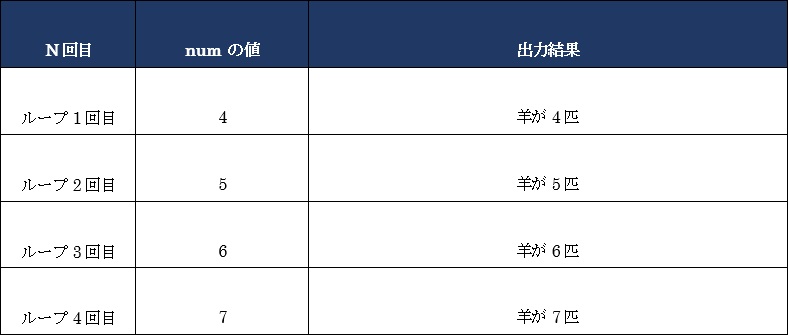 if文と同様、処理内のインデントは揃える必要があるので、気を付けてください。