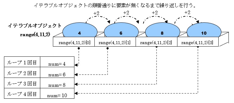 このfor文におけるイテラブルオブジェクト(凡例ではrange(4,11,2))には、「4, 6 ,8, 10」の各要素が含まれています。