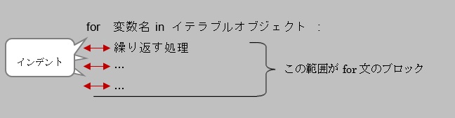 for文はリストや辞書など複数の要素を含むイテラブルオブジェクトから、それぞれの要素を順番に取り出して処理するための構文です。