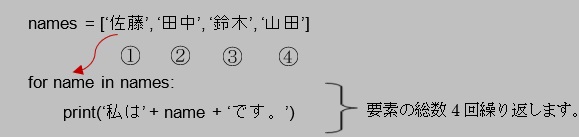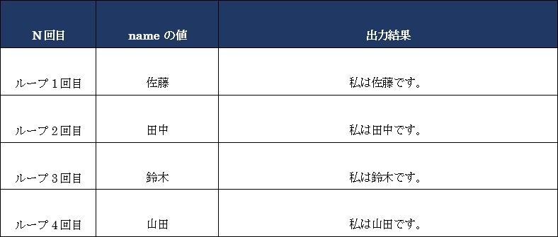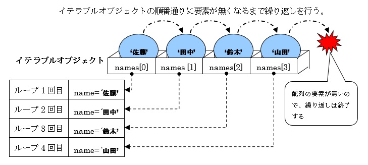 以上、構文と基本的な凡例になります。イテラブルオブジェクト(凡例ではnames)から順次取り出される要素の値をfor文内で宣言した変数(凡例ではname)に代入し、一つの処理が終わると、次の要素の値を代入します。