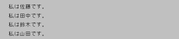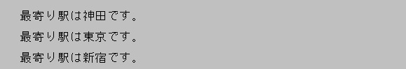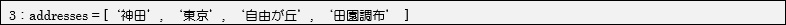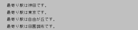[html] addresses = [‘神田’, ‘東京’, ‘自由が丘’, ‘田園調布’ ] for address in addresses : print(‘最寄り駅は’ + address + ‘です。’) [/html]実行結果