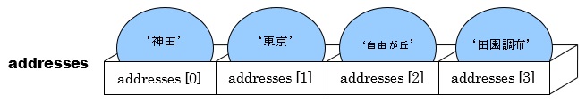 3行目でfor文で使用するリスト型の変数addressesを宣言しています。左から順番に0番を起点にインデックス番号が割り振られています。