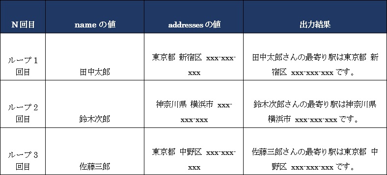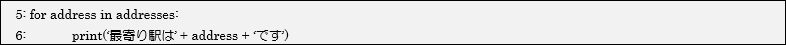 5、6行目がfor文になります。6行目ではループごとの要素の値が、addressに代入された状態で「’最寄り駅は●●です。」が出力されます。