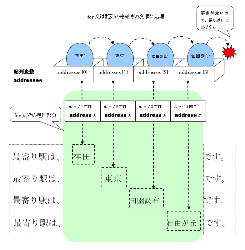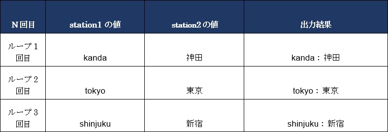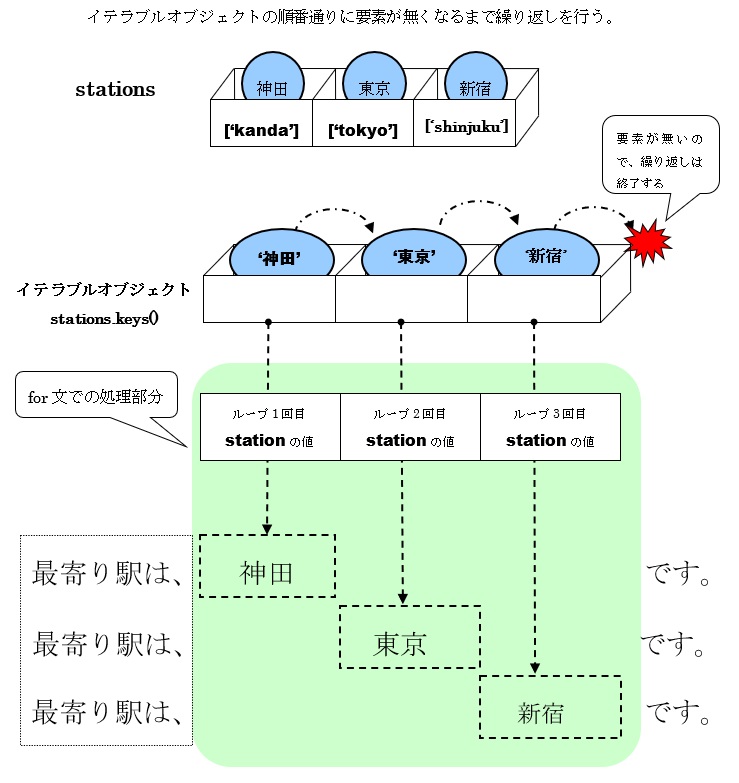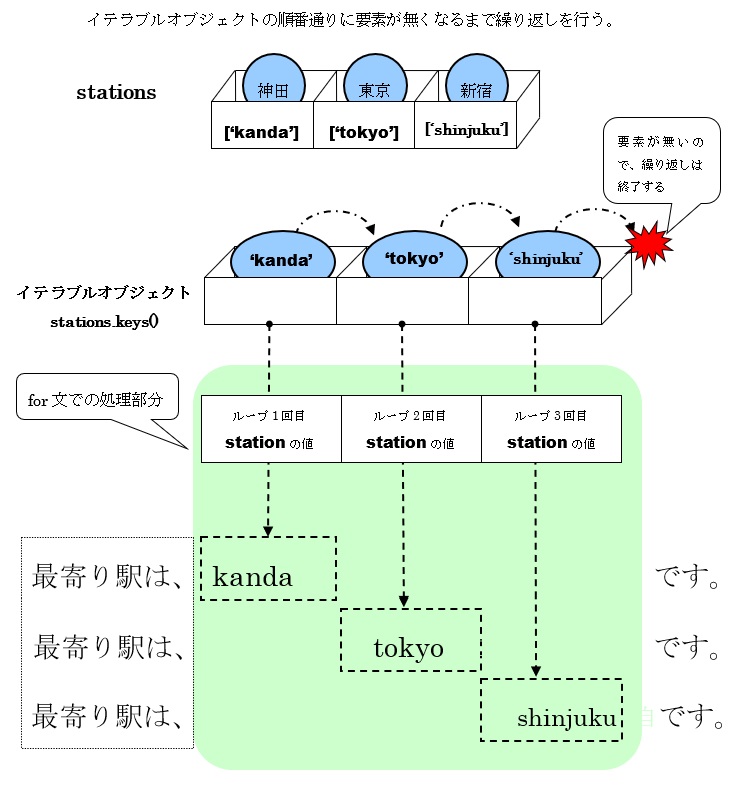 それぞれのキーは順次取り出され、for文内で宣言した変数(凡例ではstation)に代入し、一つの処理が終わると、次の要素の値を代入します。