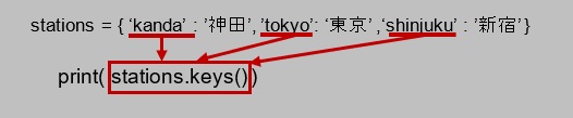 以上、構文と基本的な凡例になります。for文で取り出す要素であるイテラブルオブジェクト(凡例ではstations.keys())には、辞書内のキー一覧が取得された「辞書.keys()」を置きます。