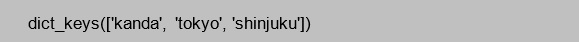 取得した一覧は、dict_keys 型と呼ばれる辞書のキー一覧を取得する時の特有のデータ型として取得されます。