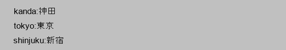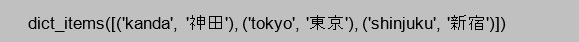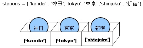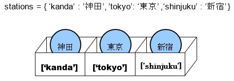 [html] stations = { ‘kanda’ : ’神田’, ’tokyo’: ‘東京’ ,‘shinjuku’ : ’新宿’ } for station in stations.keys: print(‘最寄り駅は’ + station + ‘です。’) [/html]実行結果