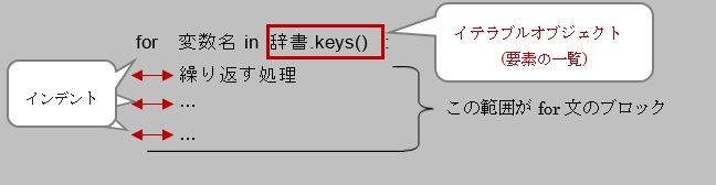 「辞書.keys()」で取得したキー一覧は、そのままfor文を介して一つ一つ要素を取り出し、処理を行うことができます。