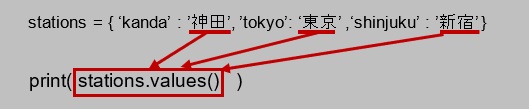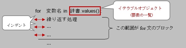 以上、構文と基本的な凡例になります。for文で取り出す要素であるイテラブルオブジェクト(凡例ではstations.values())には、辞書内の要素の値の一覧が取得された「辞書.values()」を置きます。