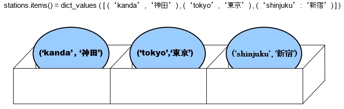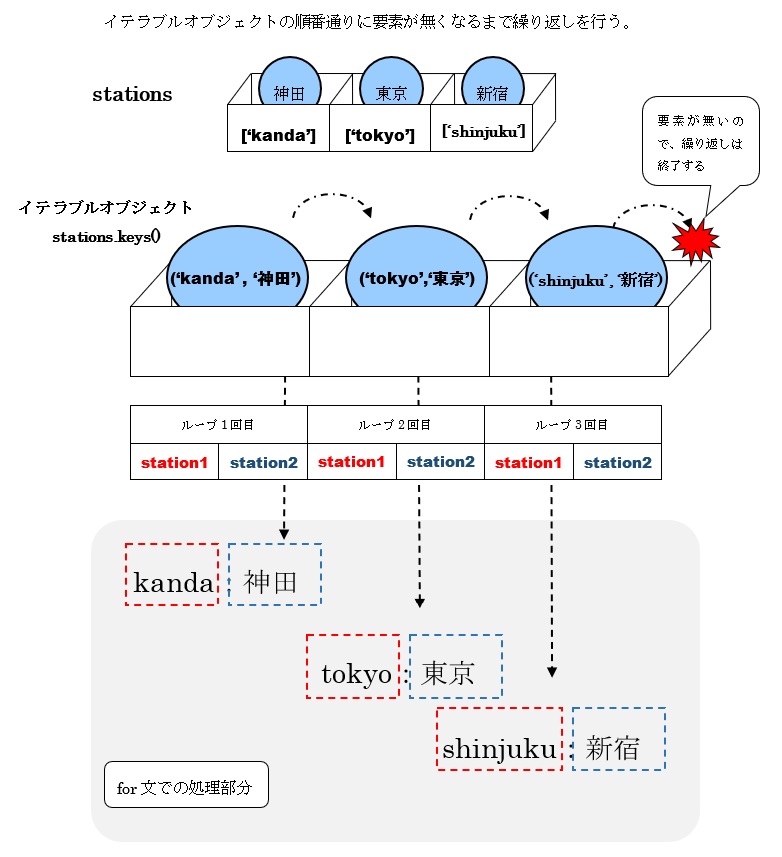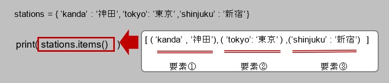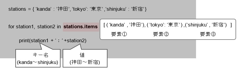 以上、構文と基本的な凡例になります。for文で取り出す要素であるイテラブルオブジェクト(凡例ではstations.items())には、辞書内の要素のキー名と値の両方が格納されたタプルの一覧が取得された「辞書.items()」を置きます。