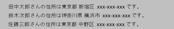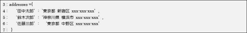 [html] #辞書型変数addressesの宣言 addresses ={ ‘田中太郎’:‘東京都 新宿区 xxx-xxx-xxx’, ‘鈴木次郎’:‘神奈川県 横浜市 xxx-xxx-xxx’, ‘佐藤三郎’: ‘東京都 中野区 xxx-xxx-xxx’ } for name, address in addresses.items() : print( name +‘さんの最寄り駅は’ + address + ‘です。’) [/html]実行結果
