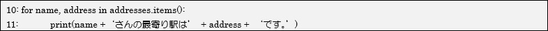 10、11行目がfor文になります。11行目のstation1、station2には各要素のキーと値が代入された状態で「’〇〇さんの最寄り駅は●●です。」が出力されます。