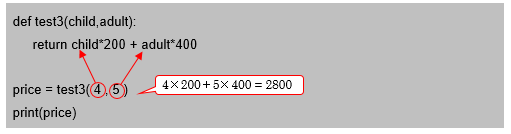 [python] def 関数名(引数名①,引数名②) 処理内容… return 変数名 = 関数名( 引数名① = 引数の値① , 引数名② =引数の値②… ) [/python]