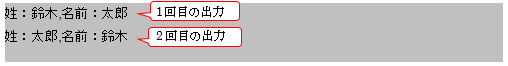 2回目の関数では、それぞれ引数に、last_nameには「鈴木」、first_nameには「太郎」を代入したため、「姓:鈴木,名前:太郎」が出力されます。