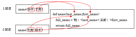 [python] def name(last_name,first_name): full_name = ‘姓:’+last_name+’,名前:’+first_name return full_name print(name(‘鈴木’,’太郎’)) print(name(‘太郎’,’鈴木’)) [/python]実行結果