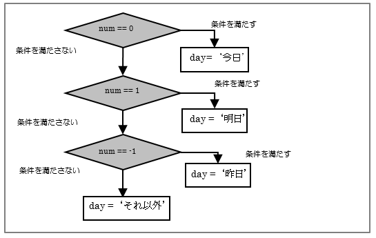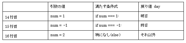 [python] print(‘引数1:’,num_to_day(1)) print(‘引数-1:’,num_to_day(-1)) print(‘引数2:’,num_to_day(2)) [/python]14行目に関しては、「if num == 1:」を満たすため、戻り値dayに「明日」が代入され、「引数1: 明日」が出力されます。15行目に関しても、「if num == −1:」を満たすため、戻り値dayに「昨日」が代入され、「引数-1: 昨日」と出力されますが、16行目はどの条件式も満たさないので、「それ以外」が代入され「引数2: それ以外」が出力されます。
