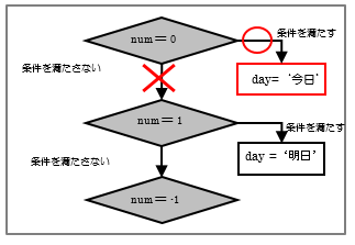 この関数の内部では、条件分岐が指定されており、numの値によって、戻り値となるdayに格納される値が異なります。